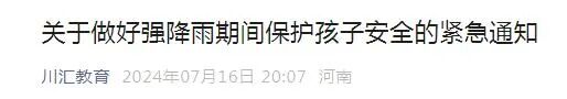7月16日晚,川汇区教体局发布《关于做好强降雨期间保护孩子安全的紧急通知》,提醒家长注意孩子安全,防止溺水事故发生。具体内容如下:
